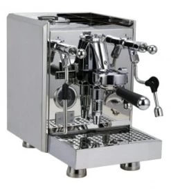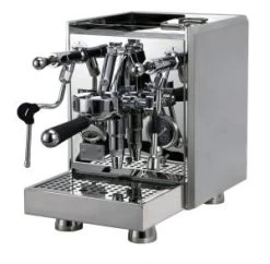 The machine boasts PID temperature and shot time control as well as two pressure gauges for steam and pump pressure. The external glass water tank, ensures absolute temperature stability, rounds off the design.