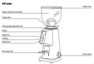 This electronic version of F4Nano has a single-dose system. And choices of single or double shot grinds. This grinder comes with standard coating and fork, you can adjust the grind with the ring nut available.