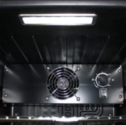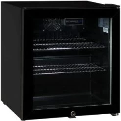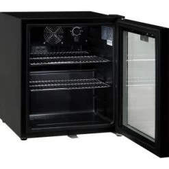 | Black Tropical rated glass door mini bar fridge, very well built unit with internal fan, chromed shelves, reversible door with lock and brilliant finish. Very stable temperature and plenty of shelf adjustments utilizing 1 x full sized and 1 x half sized shelf. Proven already in the market over a long time. |