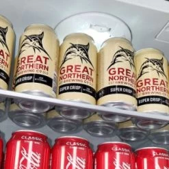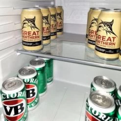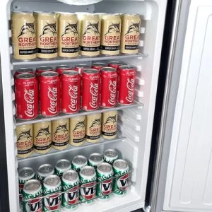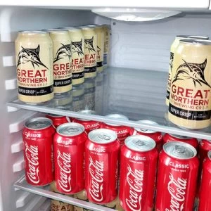 | Energy Efficient Quiet Drinks Bar Fridge With 10 Star Rating, Fits 120 x Cans. Unit has reversible door, adjustable shelves, lock, glass shelving and is all fridge for drinks with no freezer or inner door shelving that takes up room. |