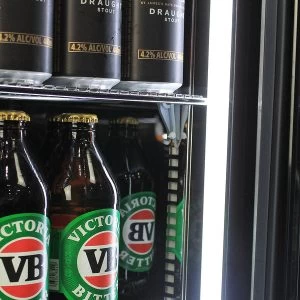 | Quiet running under bench front venting glass door bar fridge. Unit has heated glass that stops condensation, adjustable H/D shelves and lock. Brand name parts include quality Schmick ECO electronic controller, German EBM fans, Taiwanese transformers and quality low energy compressor for reliable operation. Switchable ‘colour’ LED light can be either blue or white, units have 3 x full ‘soft’ strips on sides and inner top for great lighting effect. *This unit is also available in right hinged (Model SK116R-HD) |