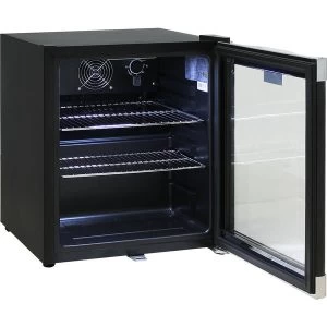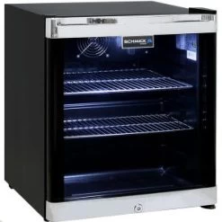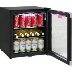 | Tropical rated glass door mini bar fridge, very well built unit with internal fan, chromed shelves, chrome door trims, lockable reversible door and a brilliant finish. Very stable temperature and plenty of shelf adjustments with 1 x full sized and 1 x half sized shelves. Proven already in the market over a long time. |
