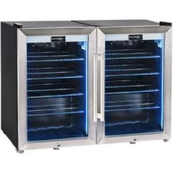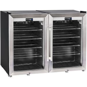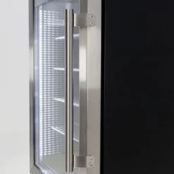| Tropical Rated Glass Door Alfresco Bar Fridge Made especially for outdoor tropical alfresco areas in Australia, note this is pigeon pair. Triple glazed stainless steel door with bar handle and lock, LED strip lighting, tropical rated with inner fan for excellent cooling. Â We designed shelving structure to allow 4 x height of cans, can fit 85 x 375ml inside each unit so 170 x cans. Perfect for that little outdoor barbie area or that shed environment for a few spare cool ones in times of need. |