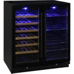 | Twin zone beer and wine fridge designed for indoor quiet applications. Slide out shelving and nice soft LED lighting make it a nice little addition to your home entertaining area. Shelving can interchange from beer and wine, the electronic touch control is a nice feature. *Note that shelving is designed for the standard 78-82mm Bordeaux bottles |